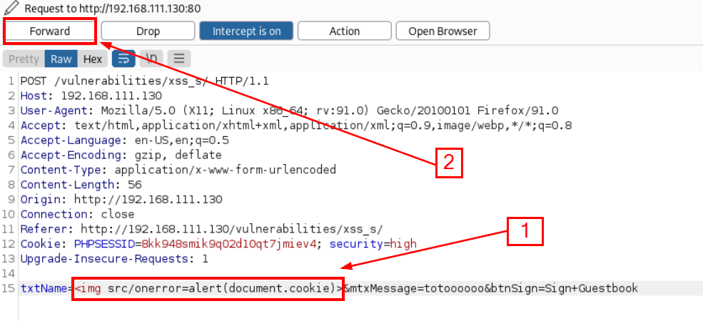 Atau kita bisa menggunakan Burpsuite. Pertama kita intercept -> ganti isian nama dengan payload kemudian kita forward