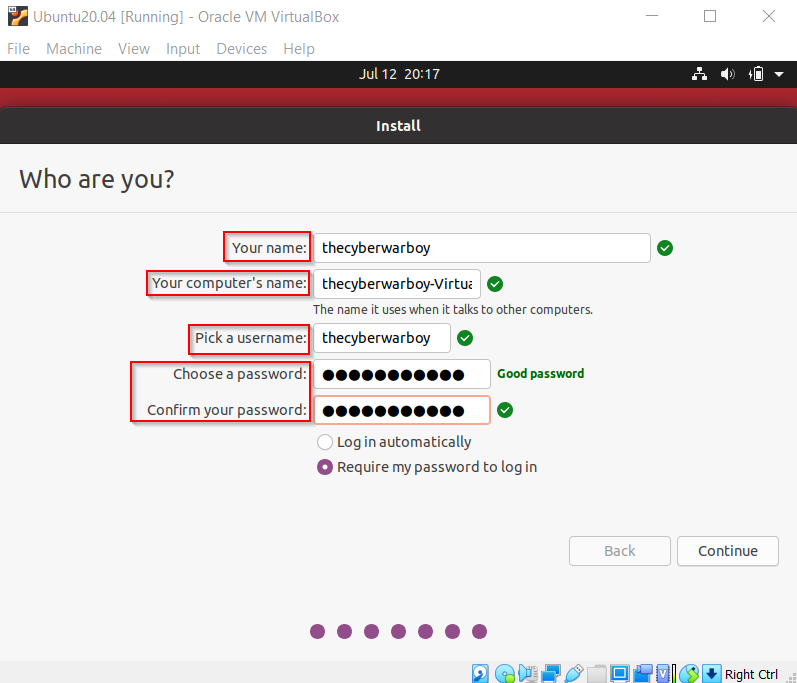 Pilih zona lokasi untuk menentukan time zone yang akan digunakan. Kemudian klik Continue. Sebelum masuk proses penginstalan kita diwajibkan untuk mengisi Nama kita, Nama komputer (Bebas mau di isi apa, Nama komputer ini digunakan ketika mesin kalian berkomunikasi dengan mesin yang lain seperti saat transfer file lewat network), useername dan password. Setelah selesai mengisi klik ”Continue”. Proses penginstalan akan berlangsung, butuh beberapa menit.
