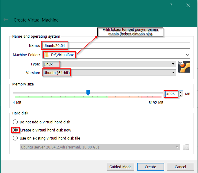 Isi nama sesuai yang kalian inginkan. Kemudian pilih folder tempat instalasi mesin. Pastikan Tipe dan Versionnya adalah Linux Ubuntu (64-bit). Sesuaikan memori dengan perangkat anda, Maksimal sebatash hijau.