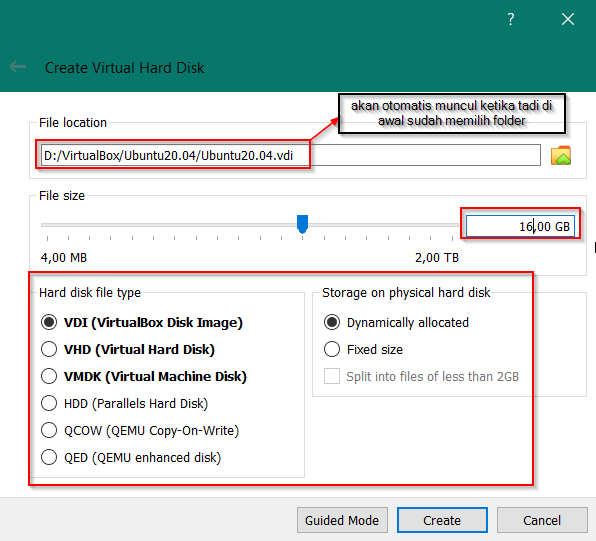 Kemudian atur file size minimal 16GB. Sesuaikan dengan gambar dan klik Create.