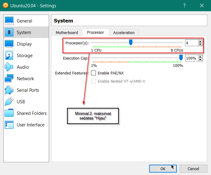 Masuk ke menu setting (sebelah New). Atur CPU processornya menjadi 4 (sesuaikan dengan perangkat anda, maksimal sebatas hijau).