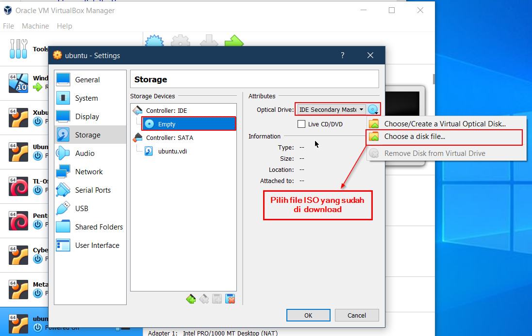Kemudian masuk ke storage dan masukkan file ISO yang sudah di download. dan klik OK.