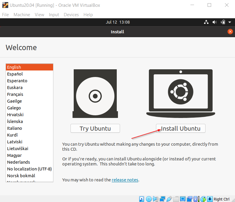 Setelah proses setting tadi selesai. Klik Start untuk menjalankan mesinnya. Setelah muncul seperti pada gambar, klik Install Ubuntu.