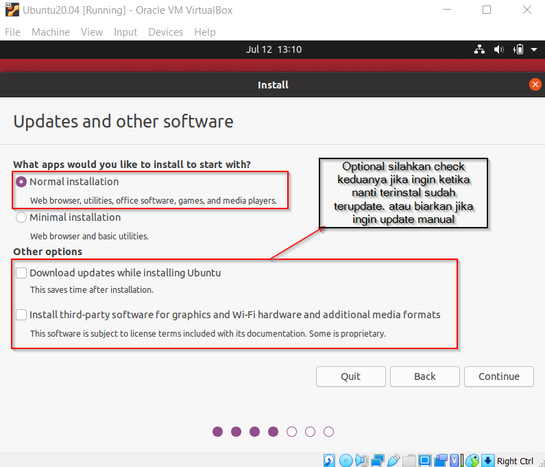 Secara default keyboard layout nya yaitu English(US). Setelah itu akan muncul seerti gambar diatas, silakan pilih normal Instalation. Jika ingin menginstal sekalian diupdate maka jangan lupa centang “Download updates while installing”. Kemudian klik continue.