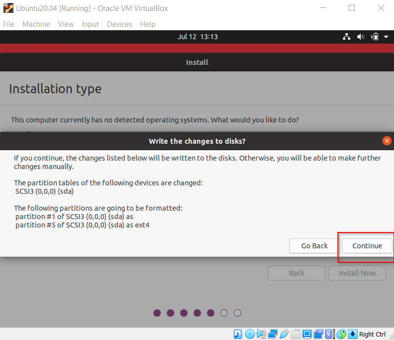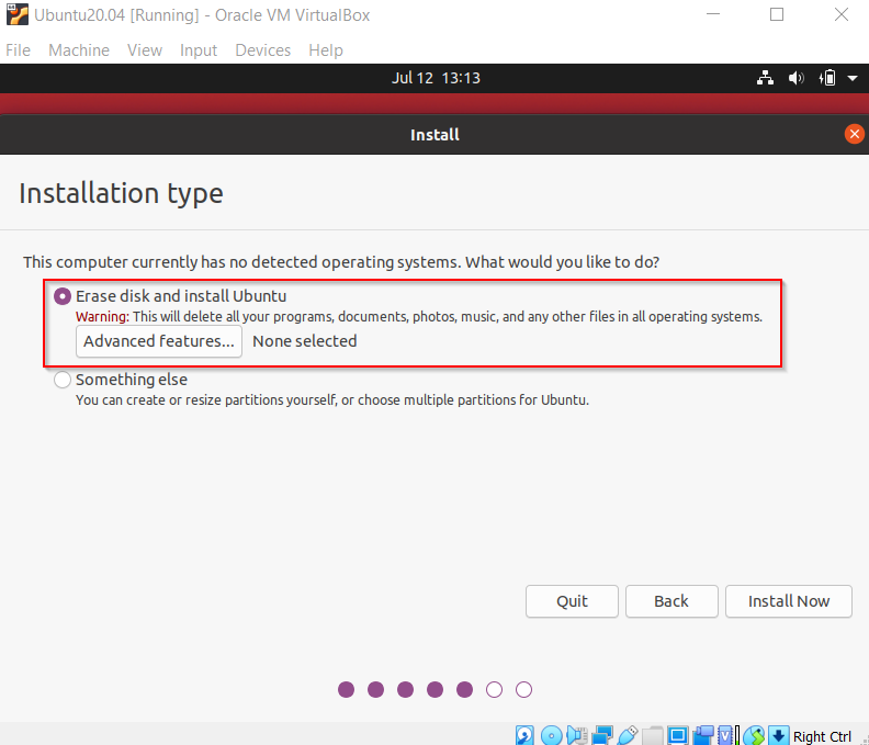 Pada Instalation Type, pilih “Erase disk and Install Ubuntu”