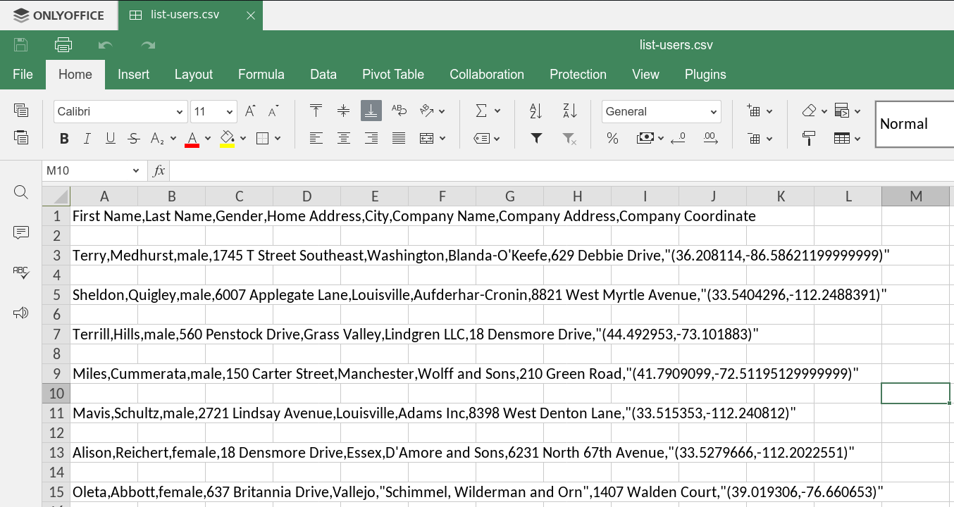 csv_data = (first_name, last_name, gender, home_address, city, company_name, company_address, geo)