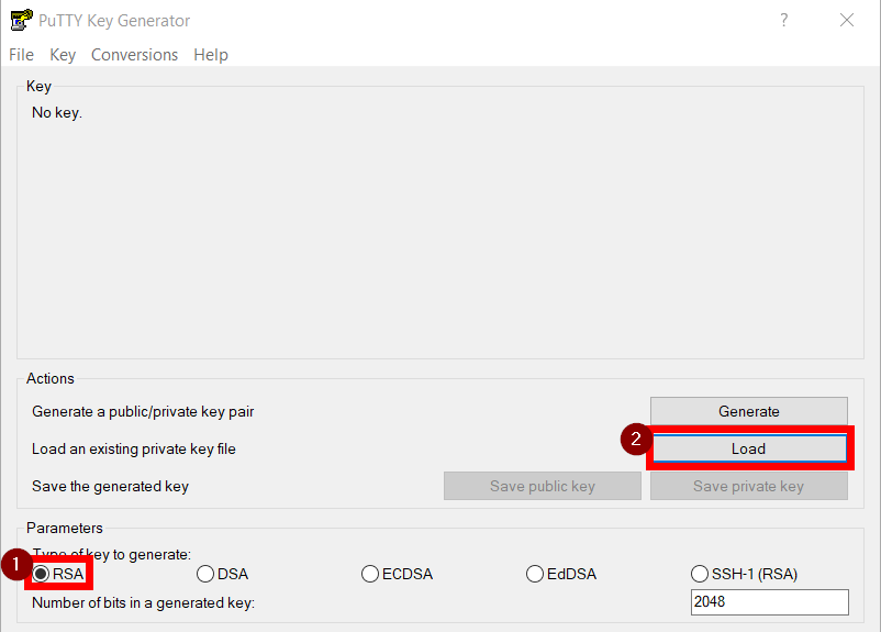 Caranya jalankan PuTTYgen. kemudian Load *.pem file