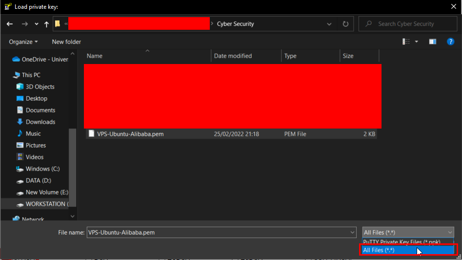 Jika autentikasi menggunakan public key dan ekstensi filenya adalah .pem maka kita perlu generate terlebih dahulu menggunakan PuTTYgen sehingga nanti menghasilkan file kunci berekstensi *.ppk karena PuTTY hanya menerima key berekstensi *.ppk