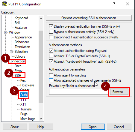 Kemudaian jalankan PuTTY, dan lakukan setup untuk Otentikasi. Pilih Connection > SSH > Auth