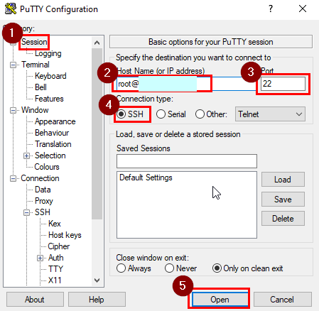 Klik Session > masukkan pada kolom hostname atau IP address menggunakan format user@